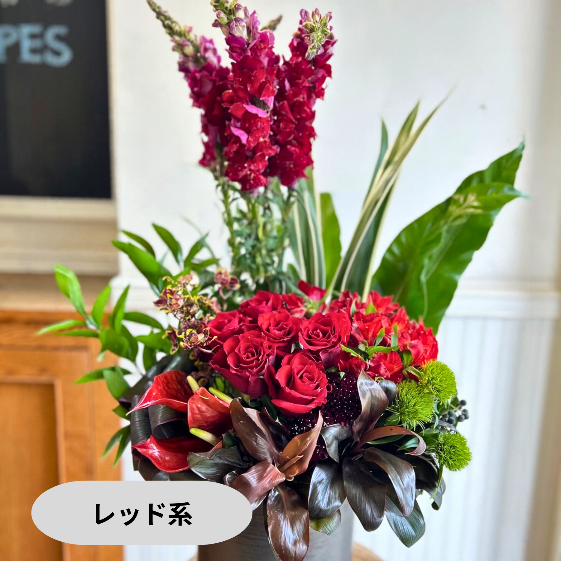 スペースに合わせて、他のアレンジメントやスタンド花と組み合わせることも可能です。