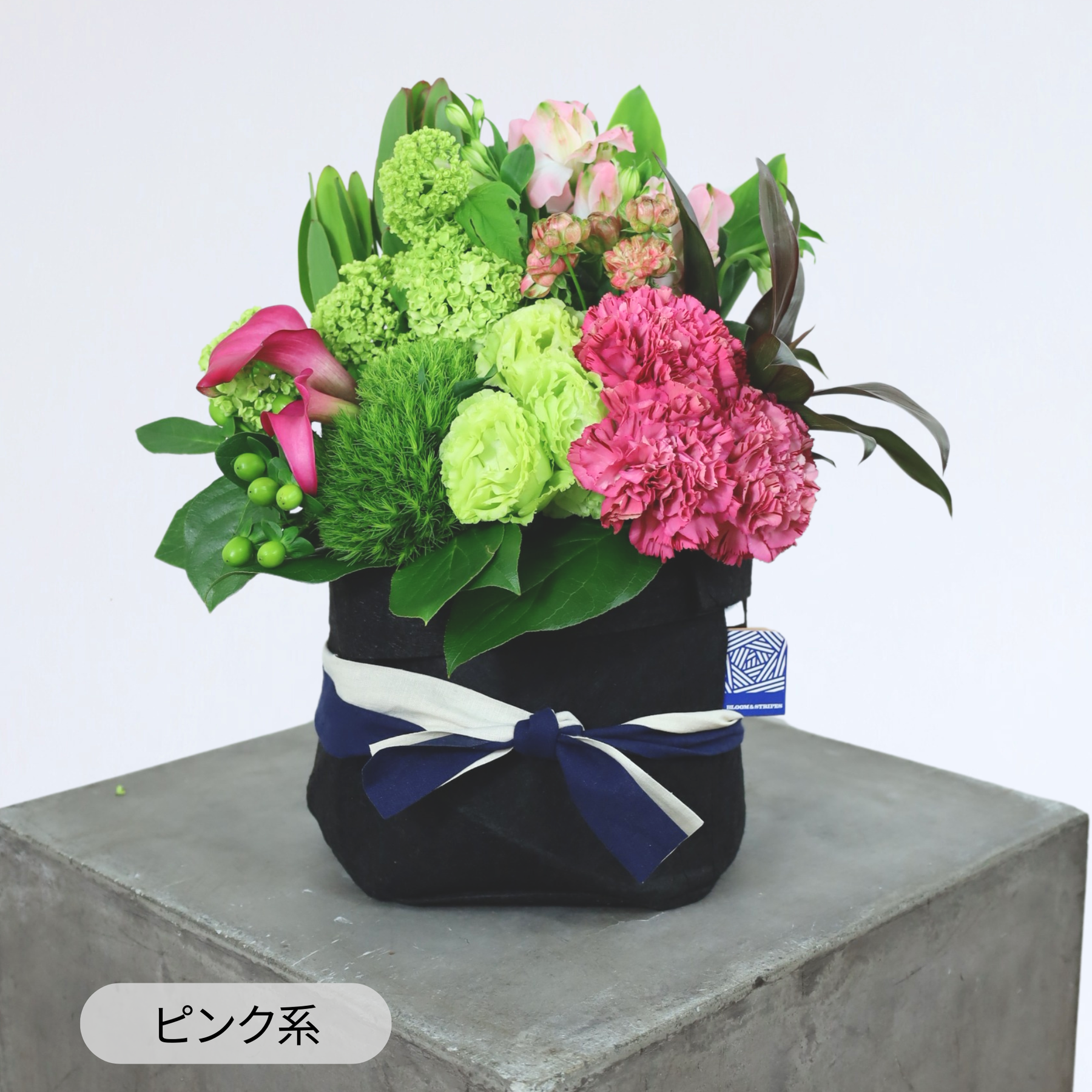 BLOOM&STRIPESのフラワーギフトです。 旬の花材を使い、誕生日・送別・お礼・お祝いなど幅広いシーンに対応するオーダーメイド商品です。 色合いや雰囲気のご要望にも柔軟に対応しています。